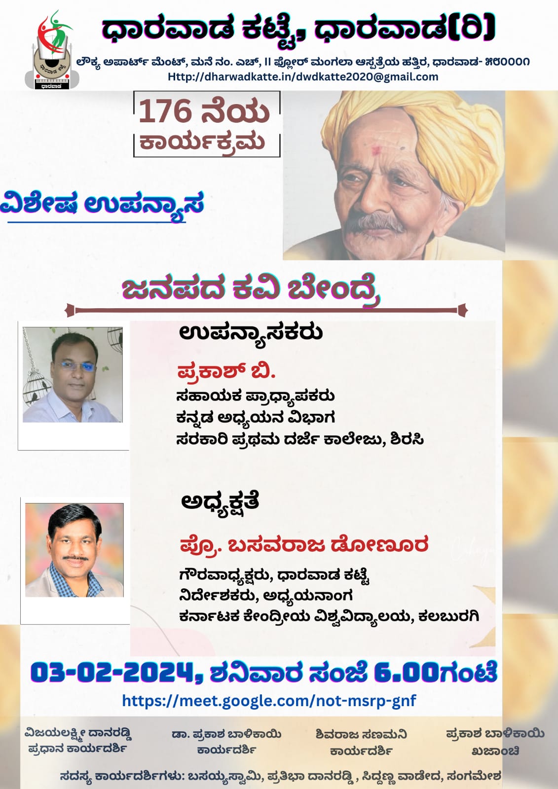 ಸರಕಾರಿ ಪ್ರಥಮ ದರ್ಜೆ ಕಾಲೇಜು, ಶಿರಸಿ ಅವರು ‘ಜನಪದ ಕವಿ ಬೇಂದ್ರೆ ‘ ಎಂಬ ವಿಷಯದ ಕುರಿತು ಮಾತನಾಡಲಿದ್ದಾರೆ.