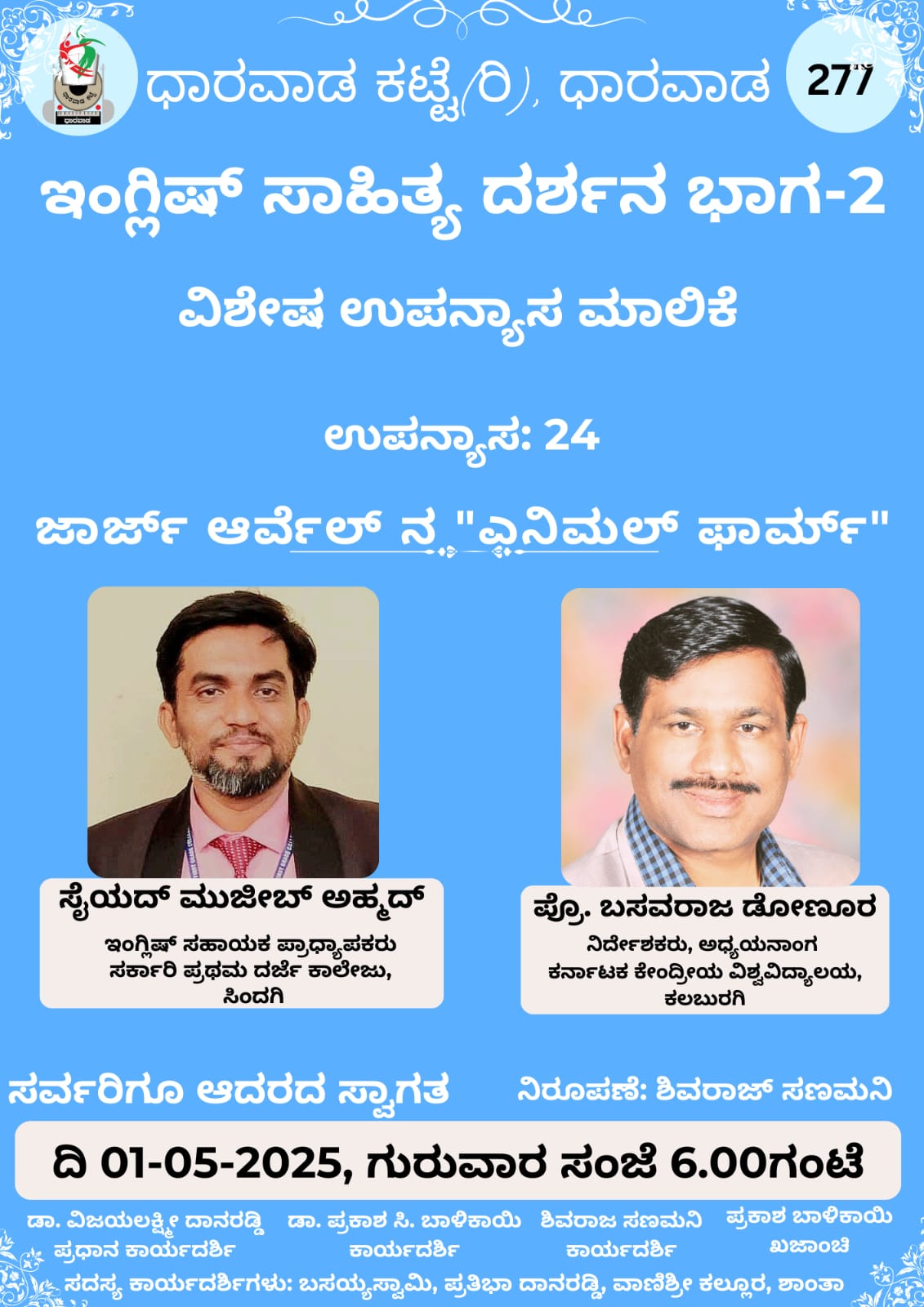 ದಿನಾಂಕ *01-05-2025 ರ ಗುರುವಾರ ಸಂಜೆ 6.00 ಗಂಟೆಗೆ* ಧಾರವಾಡ ಕಟ್ಟೆ ಆಯೋಜಿರುವ *ఇంగ్లిಷ್ ಸಾಹಿತ್ಯ ದರ್ಶನ ಭಾಗ-2* ರ *ವಿಶೇಷ ಉಪನ್ಯಾಸ ಮಾಲಿಕೆ* ಯಲ್ಲಿ *ಸೈಯದ್ ಮುಜೀಬ್ ಅಹ್ಮದ್*, ಇಂಗ್ಲಿಷ್ ಸಹಾಯಕ ಪ್ರಾಧ್ಯಾಪಕರು