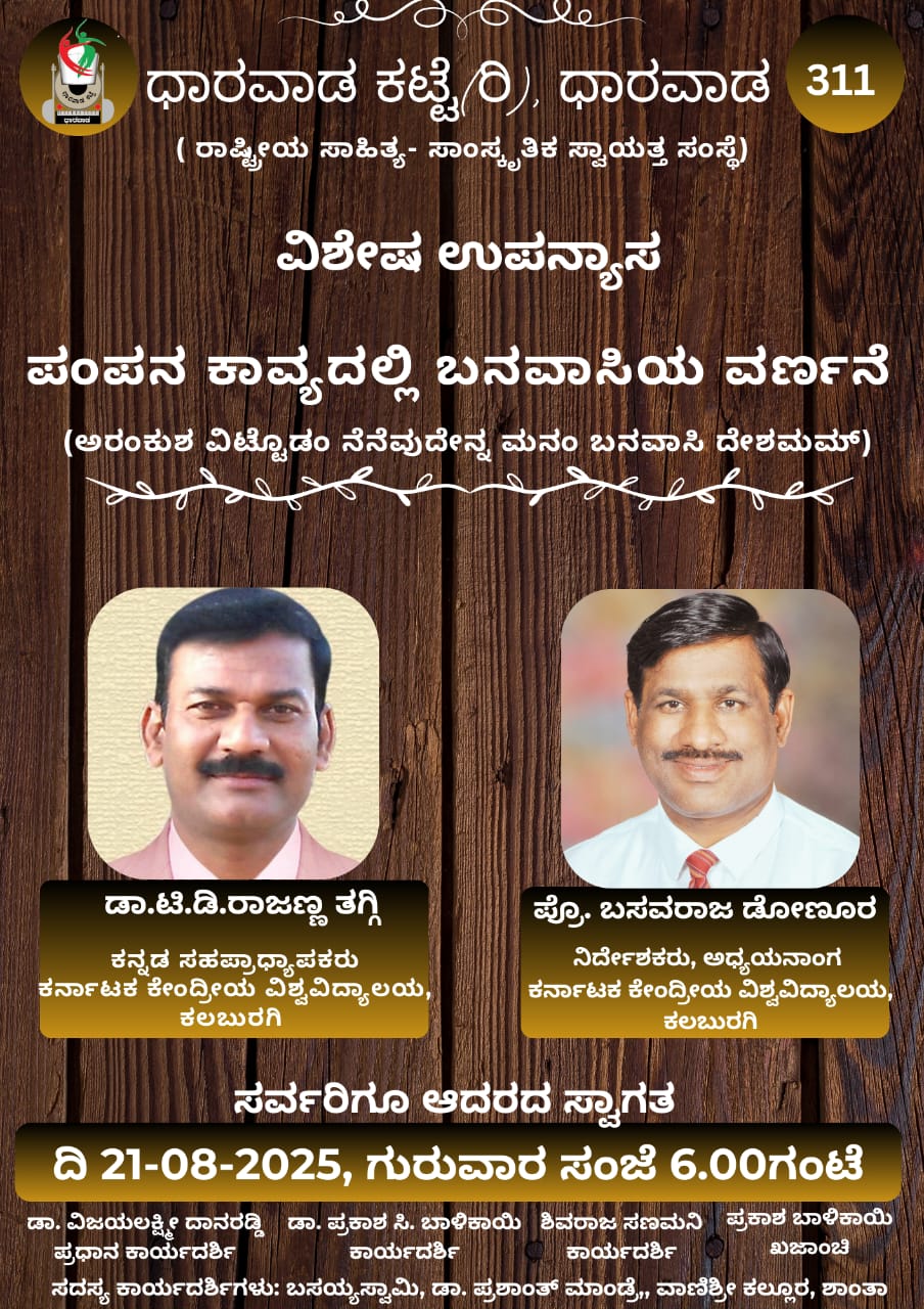 ದಿನಾಂಕ *21-08-2025 ರ ಗುರುವಾರ ಸಂಜೆ 6.00 ಗಂಟೆಗೆ* ಧಾರವಾಡ ಕಟ್ಟೆ ಆಯೋಜಿರುವ *ವಿಶೇಷ ಉಪನ್ಯಾಸ ಕಾರ್ಯಕ್ರಮ ದಲ್ಲಿ *ಡಾ.ಟಿ.ಡಿ.ರಾಜಣ್ಣ ತಗ್ಗಿ*, ಕನ್ನಡ ಸಹಪ್ರಾಧ್ಯಾಪಕರು,