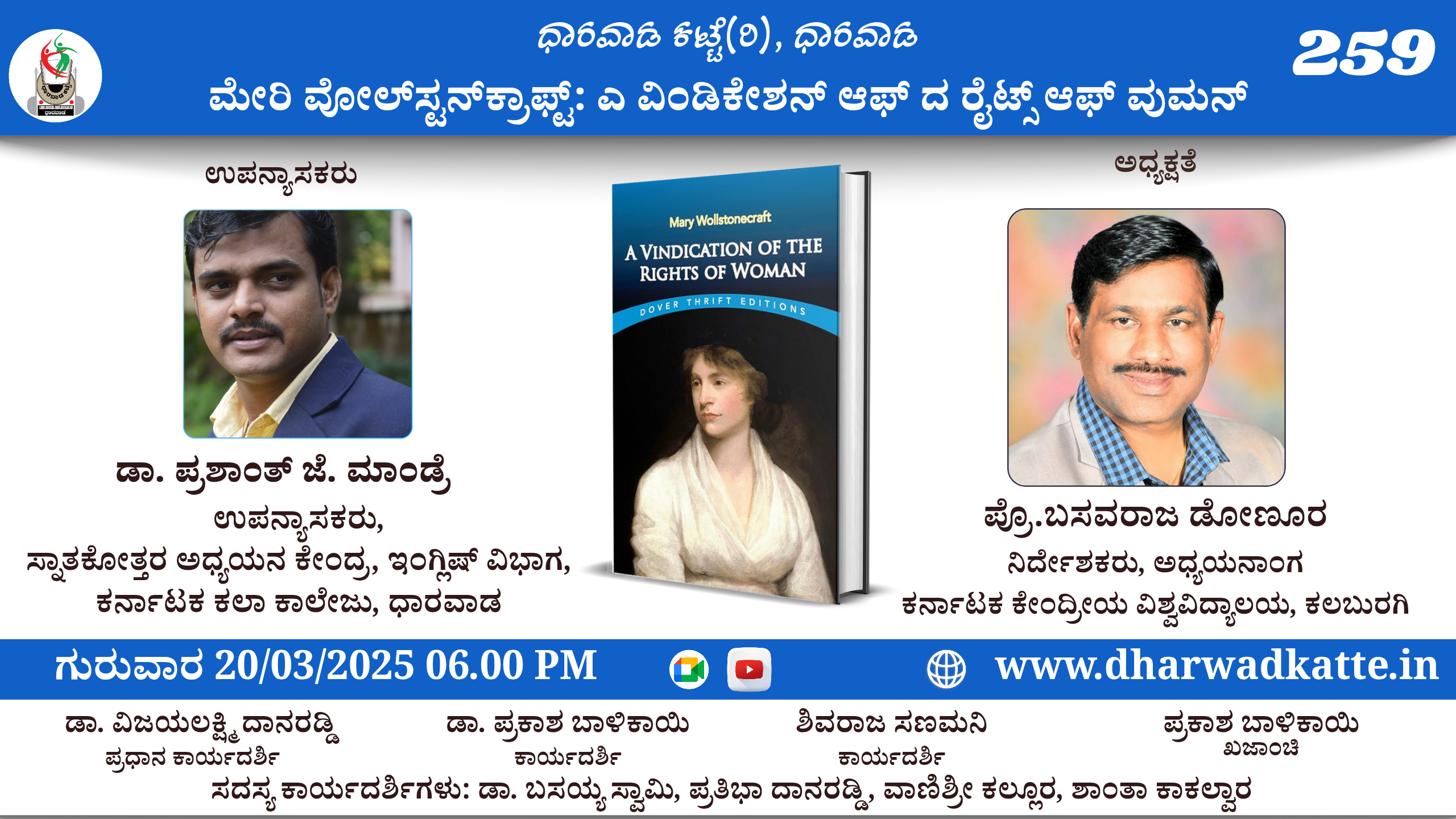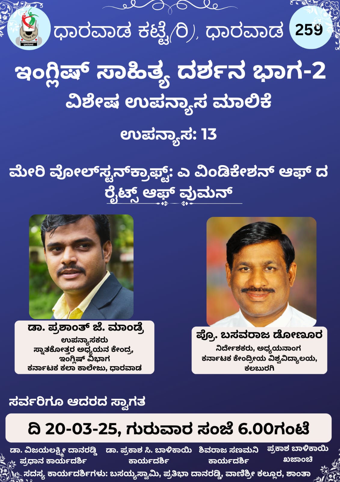 ಕರ್ನಾಟಕ ಕಲಾ ಕಾಲೇಜು, ಧಾರವಾಡ, ಇವರು *ಮೇರಿ ವೋಲ್ಸ್ಟನ್ಕ್ರಾಫ್ಟ್: ಎ ವಿಂಡಿಕೇಶನ್ ಆಫ್ ದ ರೈಟ್ಸ್ ಆಫ್ ವುಮನ್* ವಿಷಯದ ಕುರಿತು ಮಾತನಾಡಲಿದ್ದಾರೆ.