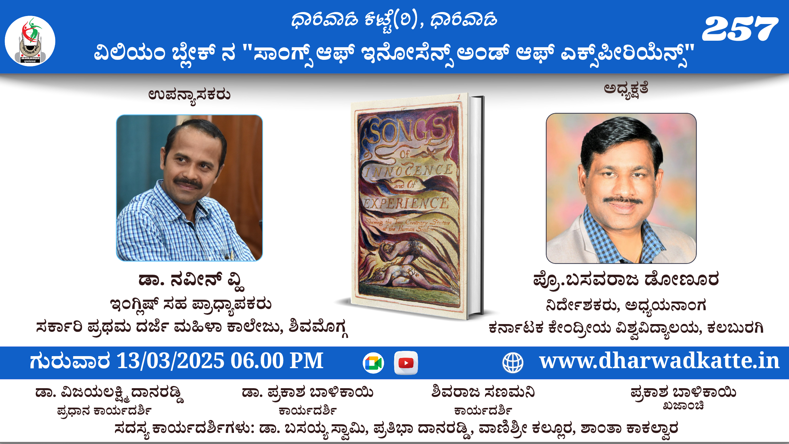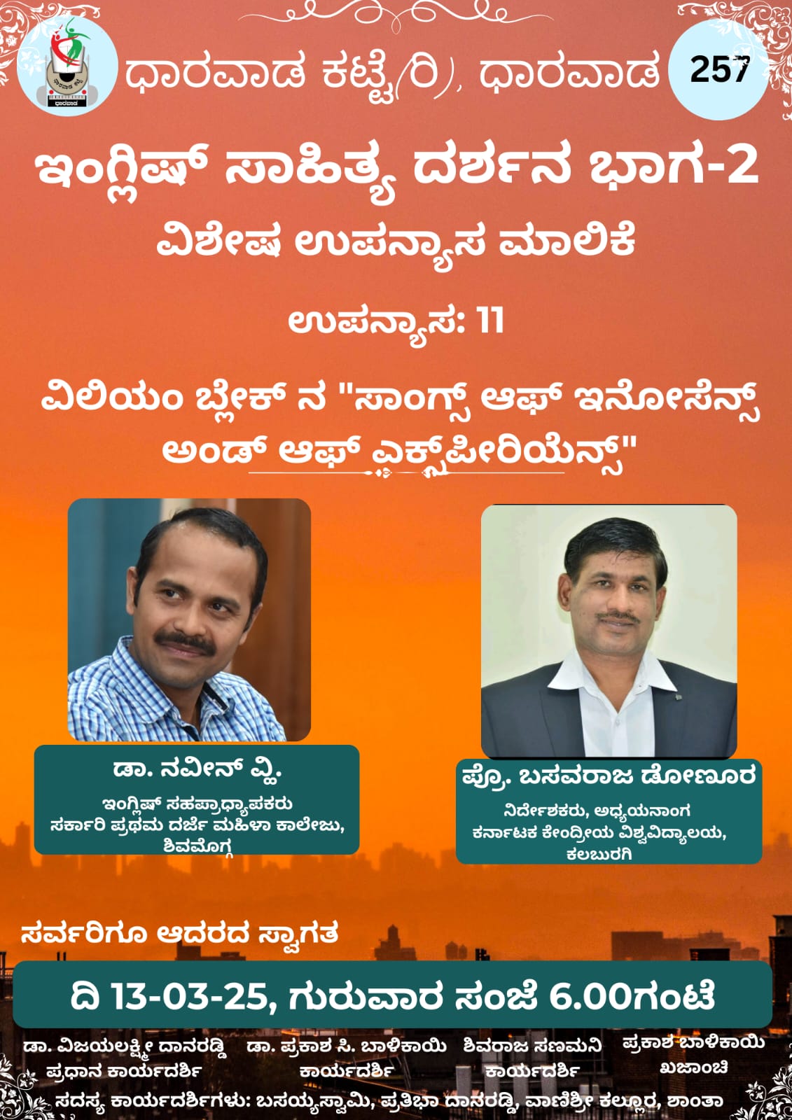 ದಿನಾಂಕ *13-03-2025 ರ ಗುರುವಾರ ಸಂಜೆ 6.00 ಗಂಟೆಗೆ* ಧಾರವಾಡ ಕಟ್ಟೆ ಆಯೋಜಿರುವ *ఇంగ్లిಷ್ ಸಾಹಿತ್ಯ ದರ್ಶನ ಭಾಗ-2* ರ *ವಿಶೇಷ ಉಪನ್ಯಾಸ ಮಾಲಿಕೆ* ಯಲ್ಲಿ *ಡಾ. ನವೀನ್ ವ್ಹಿ.*,