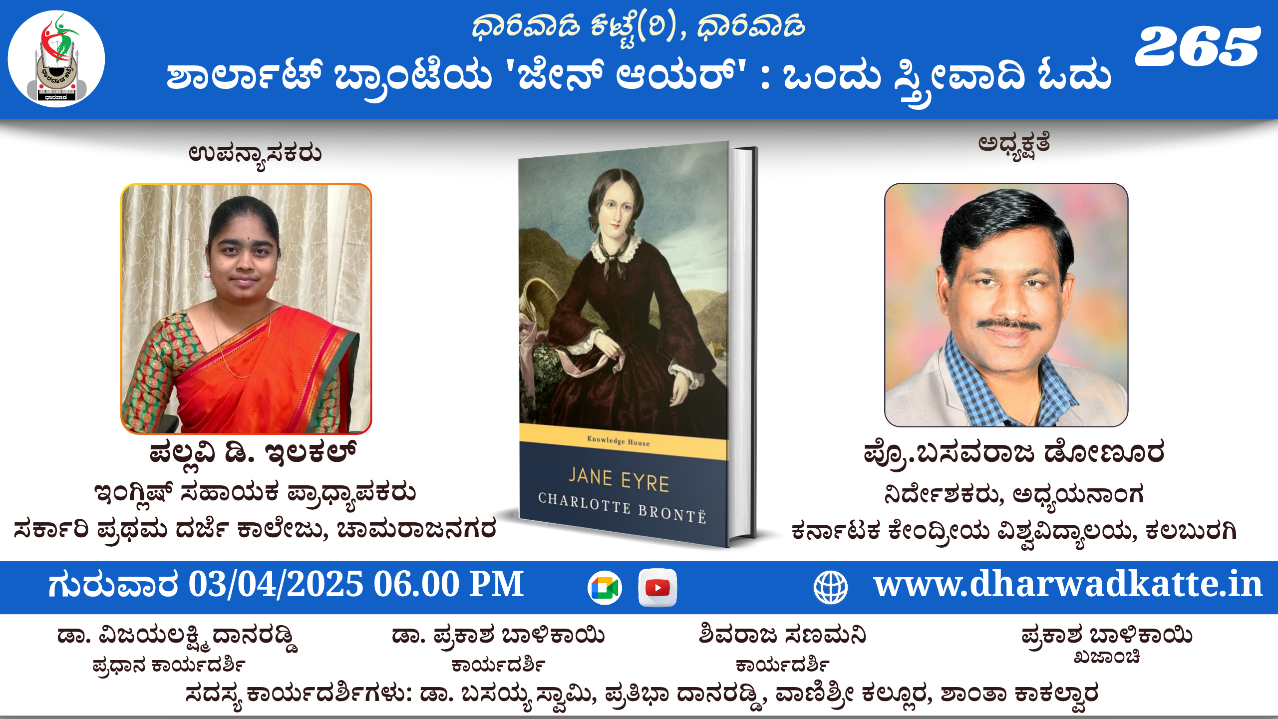 ಸರ್ಕಾರಿ ಪ್ರಥಮ ದರ್ಜೆ ಕಾಲೇಜು, ಚಾಮರಾಜನಗರ, ಇವರು *ಶಾರ್ಲಾಟ್ ಬ್ರಾಂಟೆಯ ‘ಜೇನ್ ಆಯರ್’ : ಒಂದು ಸ್ತ್ರೀವಾದಿ ಓದು”* ವಿಷಯದ ಕುರಿತು ಮಾತನಾಡಲಿದ್ದಾರೆ.