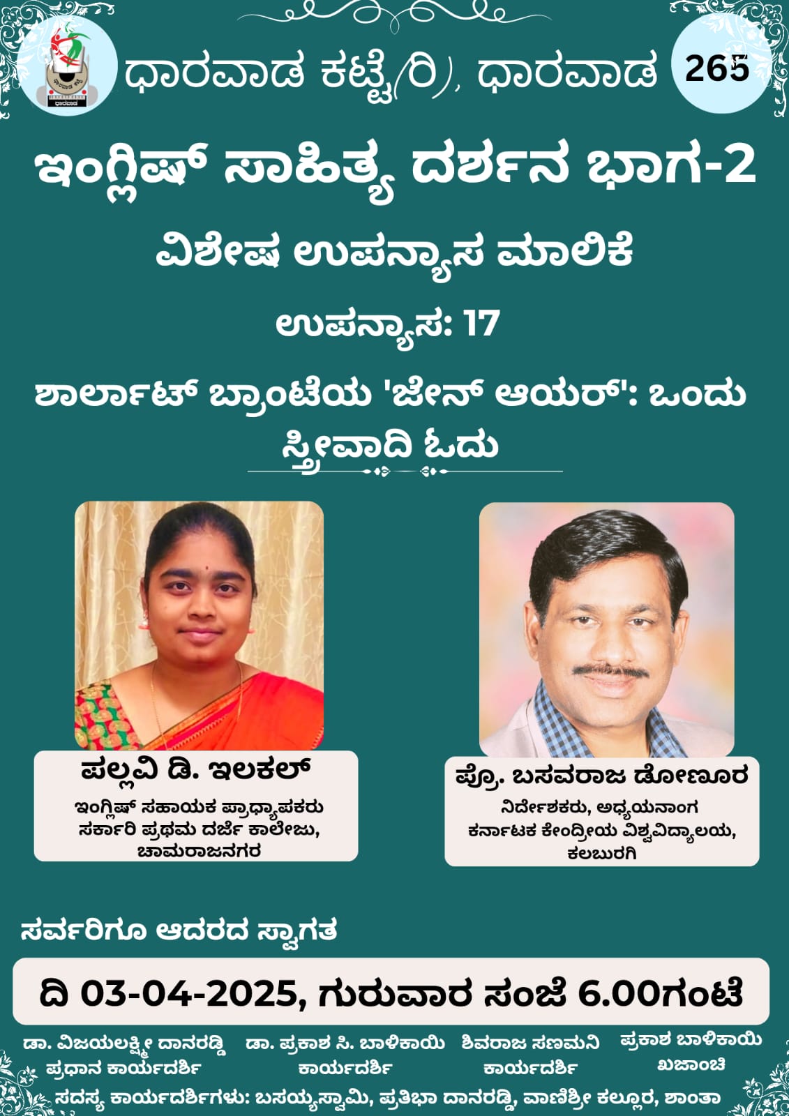 ದಿನಾಂಕ *03-04-2025 ರ ಗುರುವಾರ ಸಂಜೆ 6.00 ಗಂಟೆಗೆ* ಧಾರವಾಡ ಕಟ್ಟೆ ಆಯೋಜಿರುವ *ఇంగ్లిಷ್ ಸಾಹಿತ್ಯ ದರ್ಶನ ಭಾಗ-2* ರ *ವಿಶೇಷ ಉಪನ್ಯಾಸ ಮಾಲಿಕೆ* ಯಲ್ಲಿ *ಪಲ್ಲವಿ ಡಿ. ಇಲಕಲ್*,