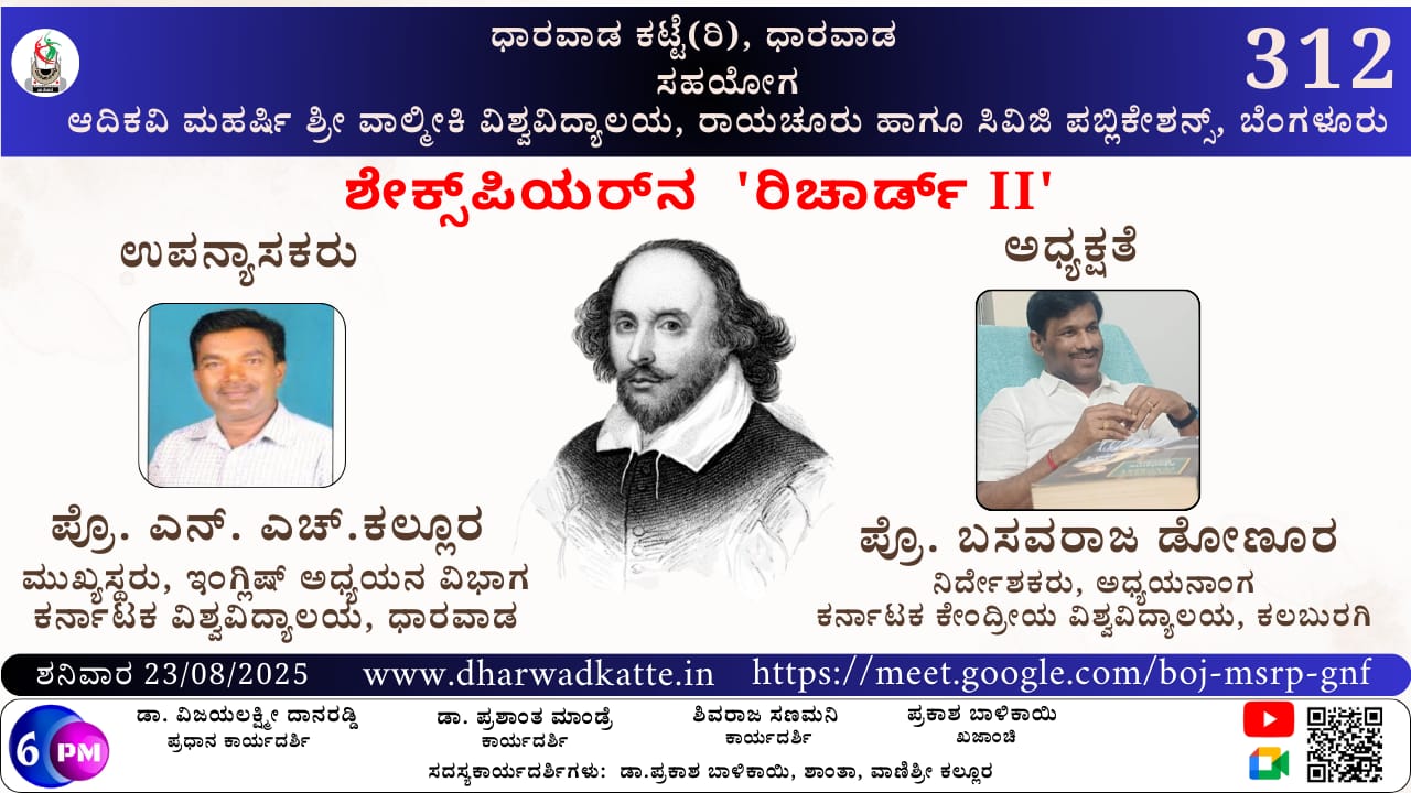 ಕರ್ನಾಟಕ ವಿಶ್ವವಿದ್ಯಾಲಯ, ಧಾರವಾಡ, ಇವರು *ಶೇಕ್ಸ್ಪಿಯರ್ ನ ‘ರಿಚಾರ್ಡ್ II’* ನಾಟಕದ ಕುರಿತು ಮಾತನಾಡಲಿದ್ದಾರೆ.