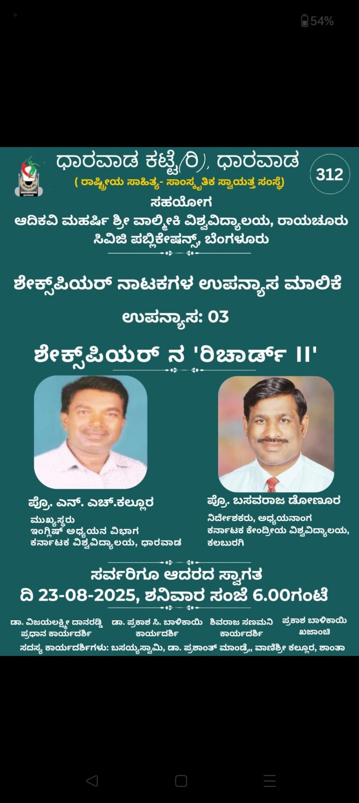 ದಿನಾಂಕ *23-08-2025 ರ ಶನಿವಾರ ಸಂಜೆ 6.00 ಗಂಟೆಗೆ* ಧಾರವಾಡ ಕಟ್ಟೆ ಆಯೋಜಿರುವ *ಶೇಕ್ಸ್ಪಿಯರ್ ನಾಟಕಗಳ ಉಪನ್ಯಾಸ ಮಾಲಿಕೆ* ಯಲ್ಲಿ *ಪ್ರೊ. ಎನ್. ಎಚ್.ಕಲ್ಲೂರ* ಮುಖ್ಯಸ್ಥರು, ಇಂಗ್ಲಿಷ್ ಅಧ್ಯಯನ ವಿಭಾಗ