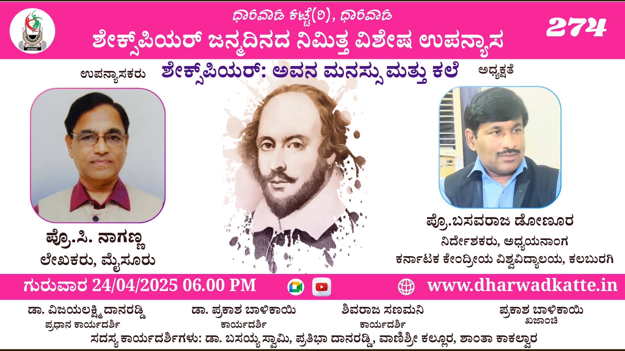 ದಿನಾಂಕ *24-04-2025 ರ ಗುರುವಾರ, ಸಂಜೆ 6.00 ಗಂಟೆಗೆ* ಧಾರವಾಡ ಕಟ್ಟೆ ಡಾ. ರಾಜಕುಮಾರ್ ಜನ್ಮದಿನದ ನಿಮಿತ್ತ ಆಯೋಜಿಸಿರುವ ವಿಶೇಷ ಉಪನ್ಯಾಸ ಕಾರ್ಯಕ್ರಮದಲ್ಲಿ *ಪ್ರೊ. ಸಿ.ನಾಗಣ್ಣ*, ಲೇಖಕರು, ಮೈಸೂರು ಇವರು *ಶೇಕ್ಸ್ ಪಿಯರ್: ಅವನ ಮನಸ್ಸು ಮತ್ತು ಕಲೆ* ಎಂಬ ವಿಷಯದ ಕುರಿತು ಮಾತನಾಡಲಿದ್ದಾರೆ.