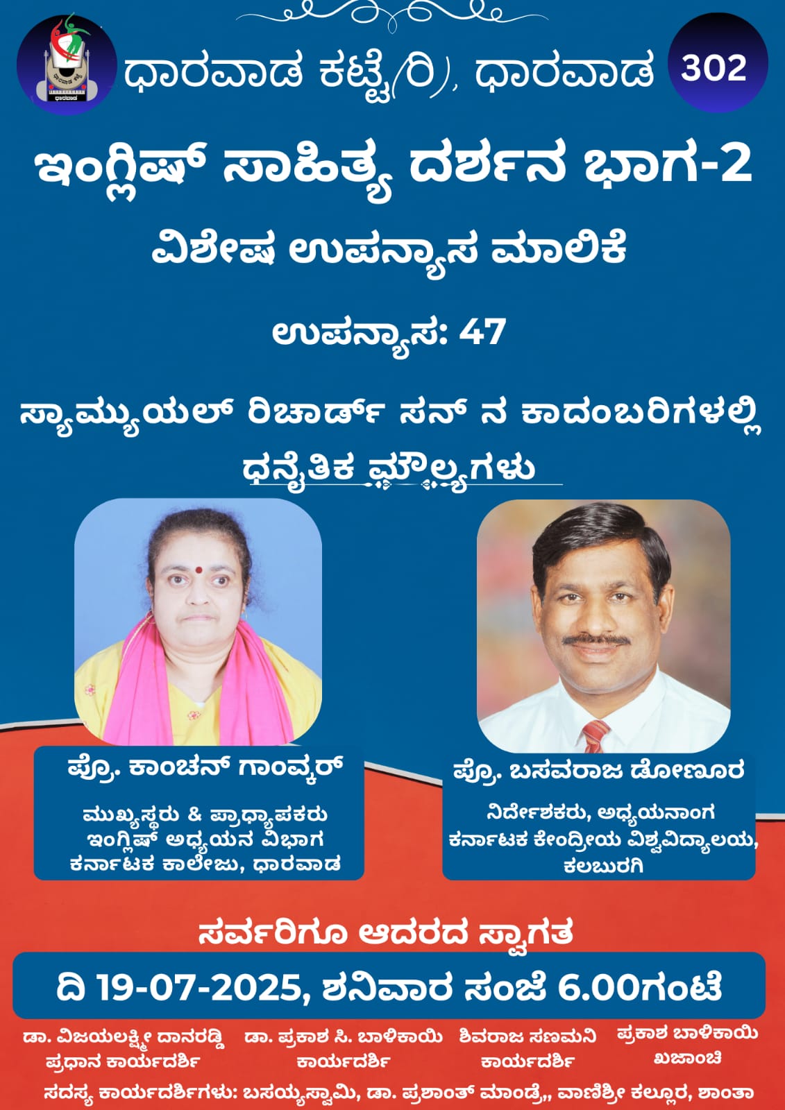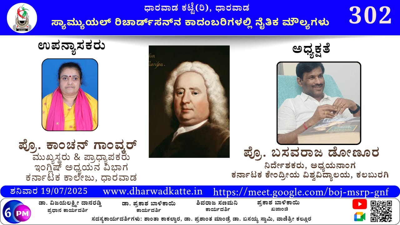 ಕರ್ನಾಟಕ ಕಾಲೇಜು, ಧಾರವಾಡ, ಇವರು *ಸ್ಯಾಮ್ಯುಯಲ್ ರಿಚಾರ್ಡ್ ಸನ್ ನ್ ಕಾದಂಬರಿಗಳಲ್ಲಿ ನೈತಿಕ ಮೌಲ್ಯಗಳು* ಕೃತಿಯ ಕುರಿತು ಮಾತನಾಡಲಿದ್ದಾರೆ.