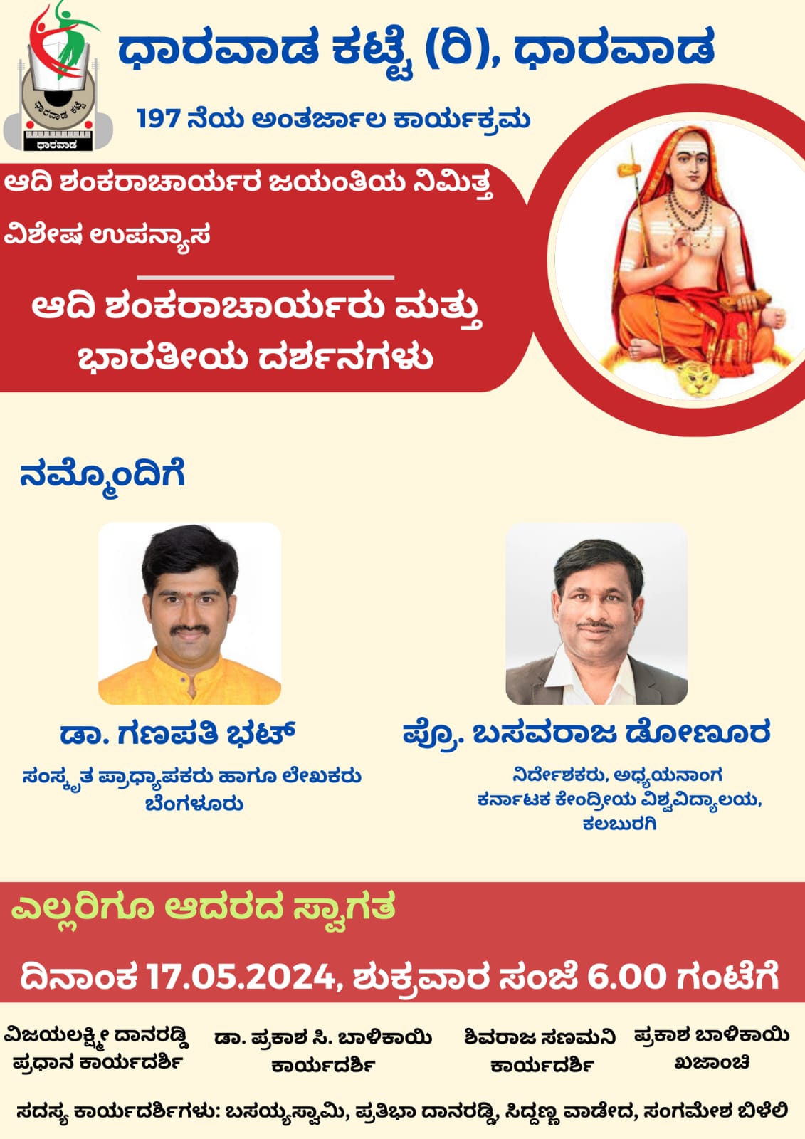 ದಿನಾಂಕ 17-05-2023 ರ ಶುಕ್ರವಾರ ಸಂಜೆ 6.00 ಗಂಟೆಗೆ “ಆದಿ ಶಂಕರಾಚಾರ್ಯರ ಜಯಂತಿ” ನಿಮಿತ್ತ ಧಾರವಾಡ ಕಟ್ಟೆ ಆಯೋಜಿರುವ ವಿಶೇಷ ಉಪನ್ಯಾಸ ಕಾರ್ಯಕ್ರಮದಲ್ಲಿ
