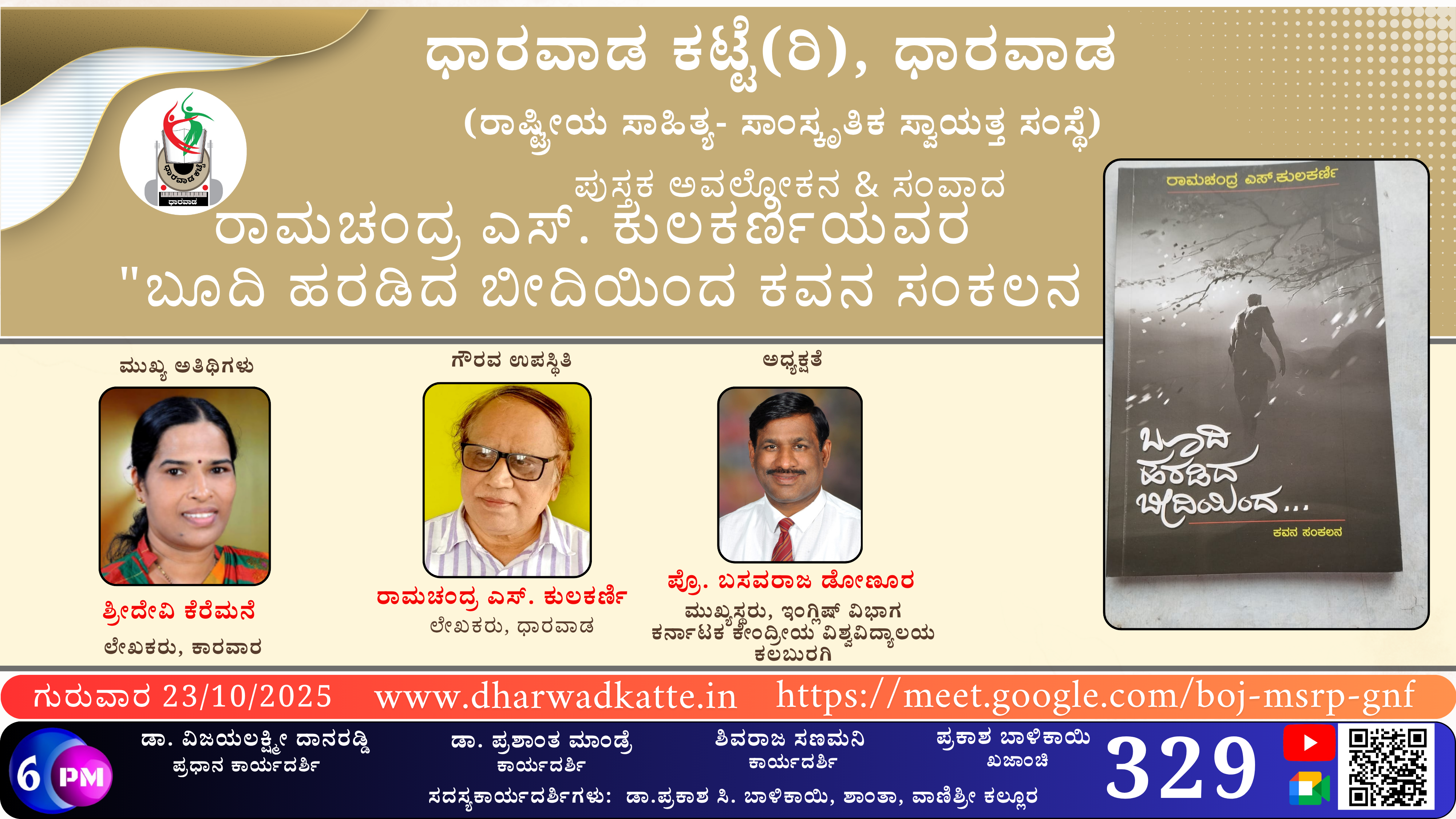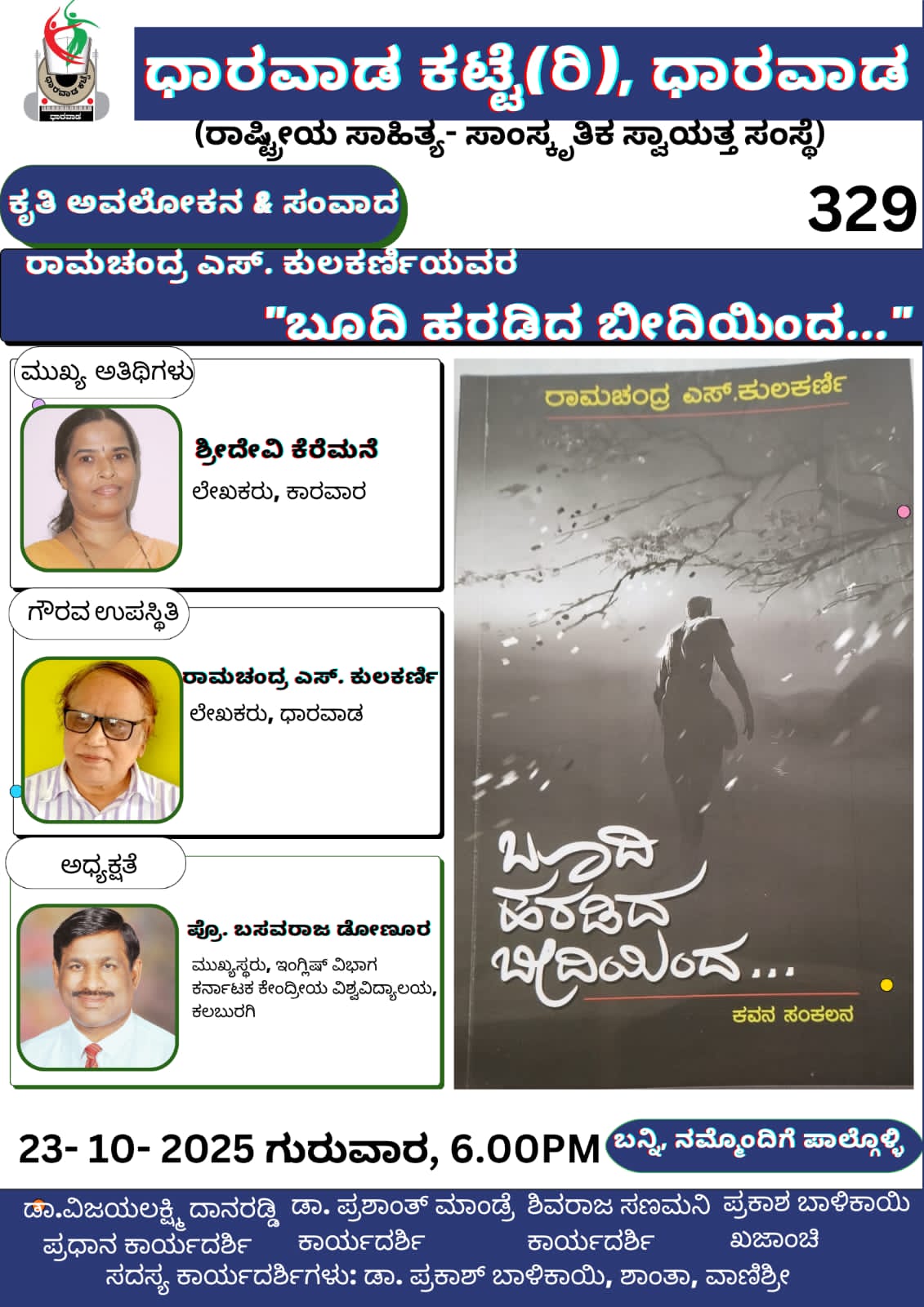 ದಿನಾಂಕ *23-10-2025 ರ ಗುರುವಾರ ಸಂಜೆ 6.00 ಗಂಟೆಗೆ* ಧಾರವಾಡ ಕಟ್ಟೆ ಆಯೋಜಿರುವ ಪುಸ್ತಕ ಪರಿಚಯ ಮತ್ತು ಸಂವಾದ ಕಾರ್ಯಕ್ರಮದಲ್ಲಿ *ಶ್ರೀದೇವಿ ಕೆರೆಮನೆ*, ಲೇಖಕರು, ಕಾರವಾರ, ಇವರು **ರಾಮಚಂದ್ರ ಎಸ್. ಕುಲಕರ್ಣಿ* ಯವರ