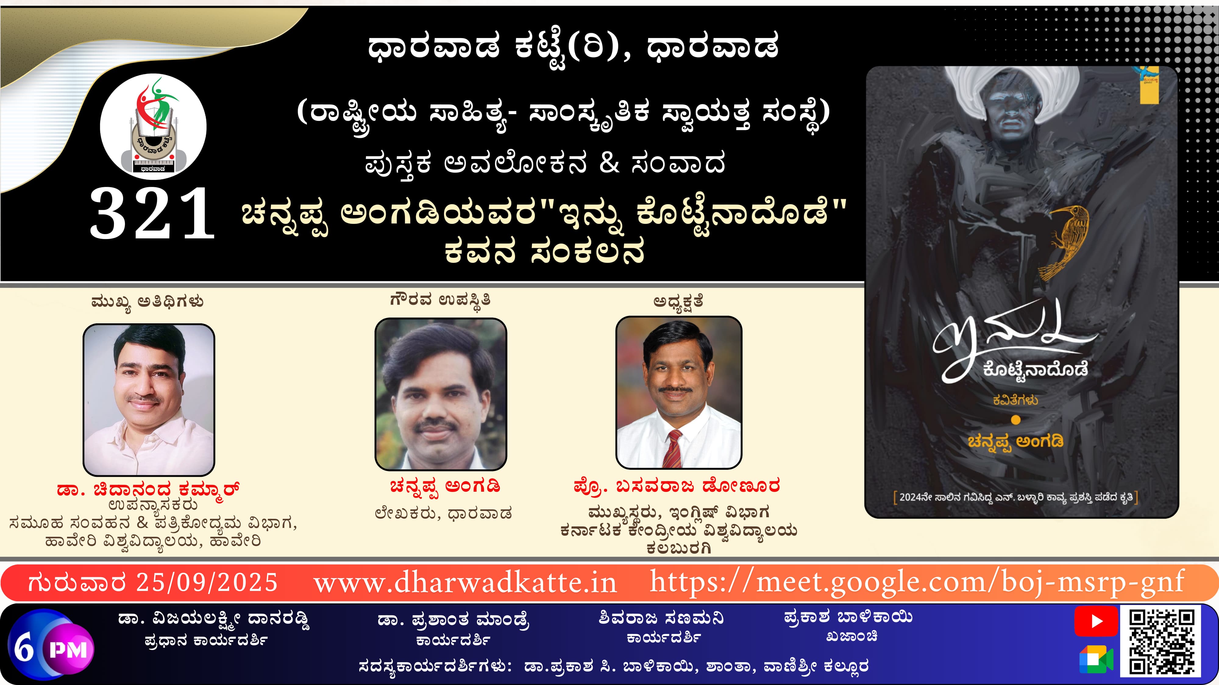 ದಿನಾಂಕ *25-09-2025 ರ ಗುರುವಾರ ಸಂಜೆ 6.00 ಗಂಟೆಗೆ* ಧಾರವಾಡ ಕಟ್ಟೆ ಆಯೋಜಿರುವ ಪುಸ್ತಕ ಪರಿಚಯ ಮತ್ತು ಸಂವಾದ ಕಾರ್ಯಕ್ರಮದಲ್ಲಿ *ಡಾ. ಚಿದಾನಂದ ಕಮ್ಮಾರ್*, ಉಪನ್ಯಾಸಕರು,