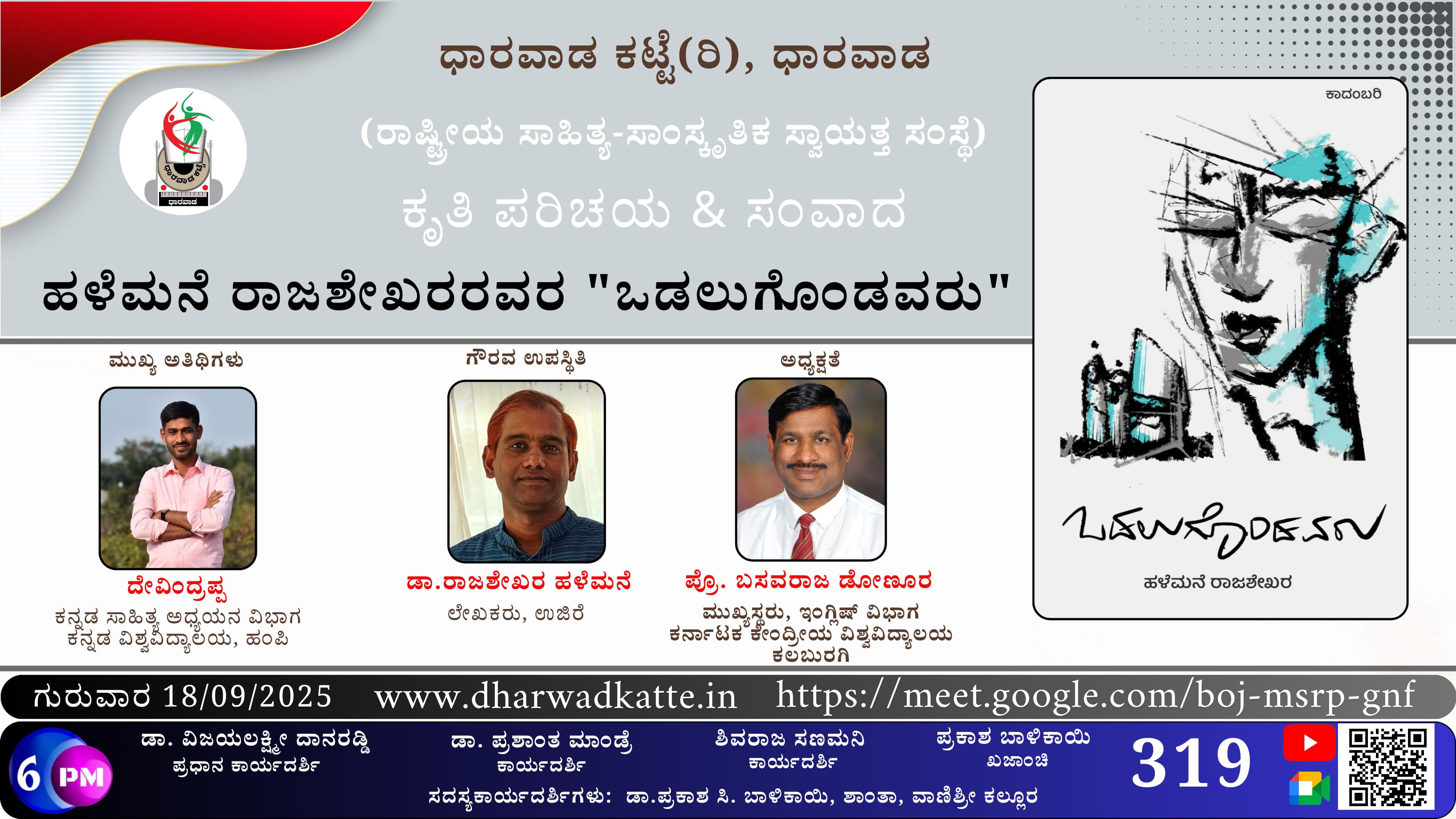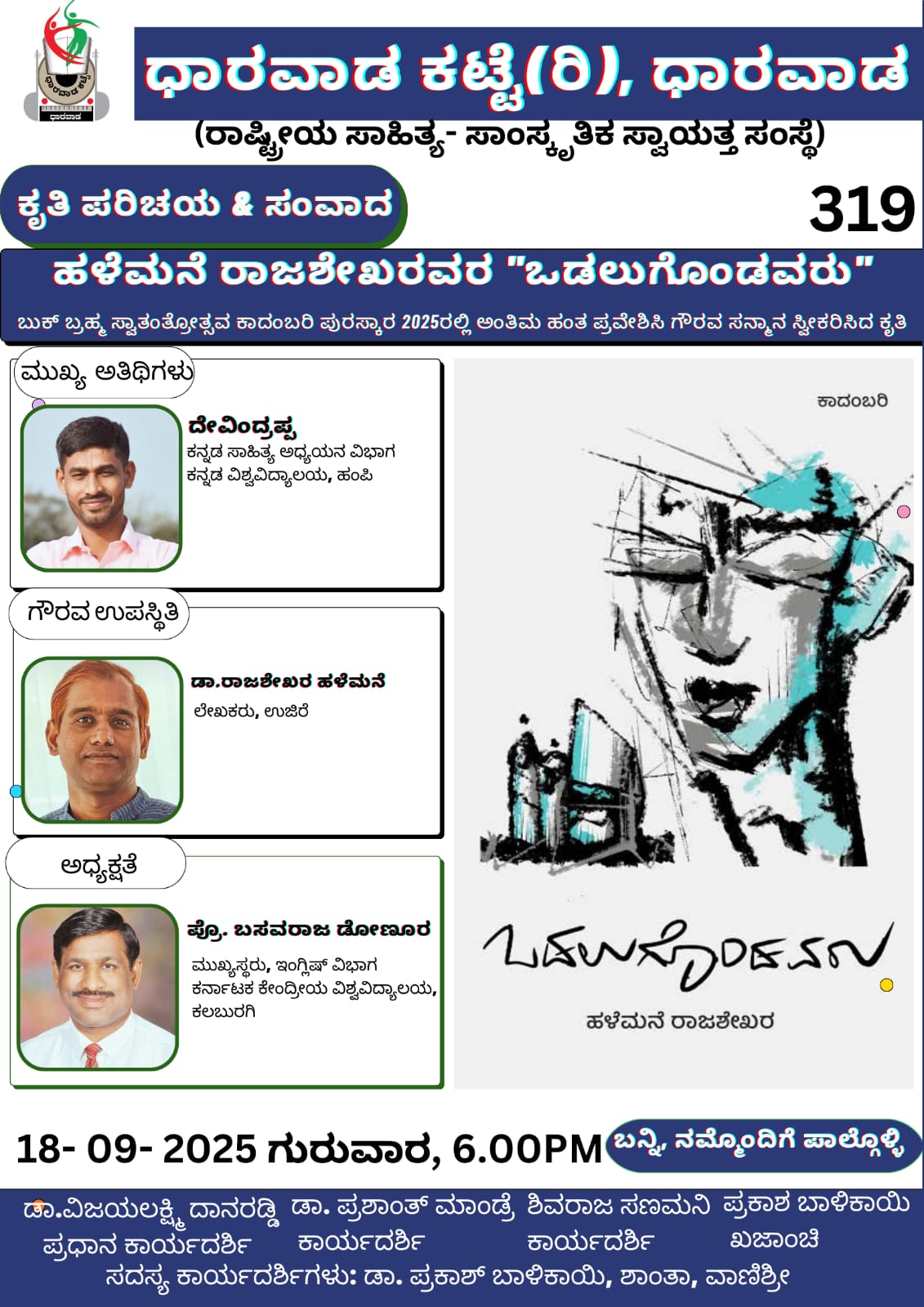 ದಿನಾಂಕ *18-09-2025 ರ ಗುರುವಾರ ಸಂಜೆ 6.00 ಗಂಟೆಗೆ* ಧಾರವಾಡ ಕಟ್ಟೆ ಆಯೋಜಿರುವ ಪುಸ್ತಕ ಪರಿಚಯ ಮತ್ತು ಸಂವಾದ ಕಾರ್ಯಕ್ರಮದಲ್ಲಿ *ದೇವಿಂದ್ರಪ್ಪ*, ಕನ್ನಡ ಸಾಹಿತ್ಯ ಅಧ್ಯಯನ ವಿಭಾಗ,