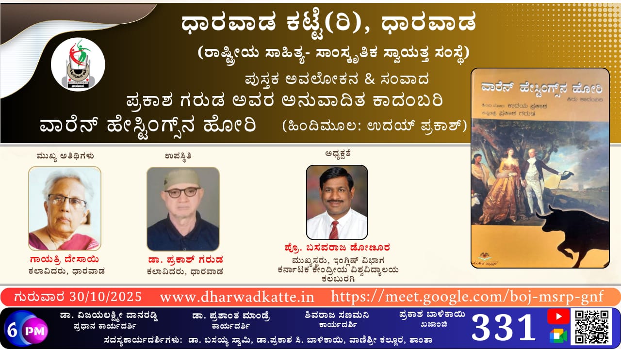 ದಿನಾಂಕ *30-11-2025 ರ ಗುರುವಾರ ಸಂಜೆ 6.00 ಗಂಟೆಗೆ* ಧಾರವಾಡ ಕಟ್ಟೆ ಆಯೋಜಿರುವ ವಿಶೇಷ ಉಪನ್ಯಾಸ ಕಾರ್ಯಕ್ರಮದಲ್ಲಿ *ಗಾಯತ್ರಿ ದೇಸಾಯಿ* , ಕಲಾವಿದರು, ಧಾರವಾಡ ಇವರು *ಪ್ರಕಾಶ್ ಗರುಡ* ಅವರ ಅನುವಾದಿತ ಕಾದಂಬರಿ *”ವಾರೆನ್ ಹೆಸ್ಟಿಂಗ್ಸ್ ನ ಹೋರಿ”*