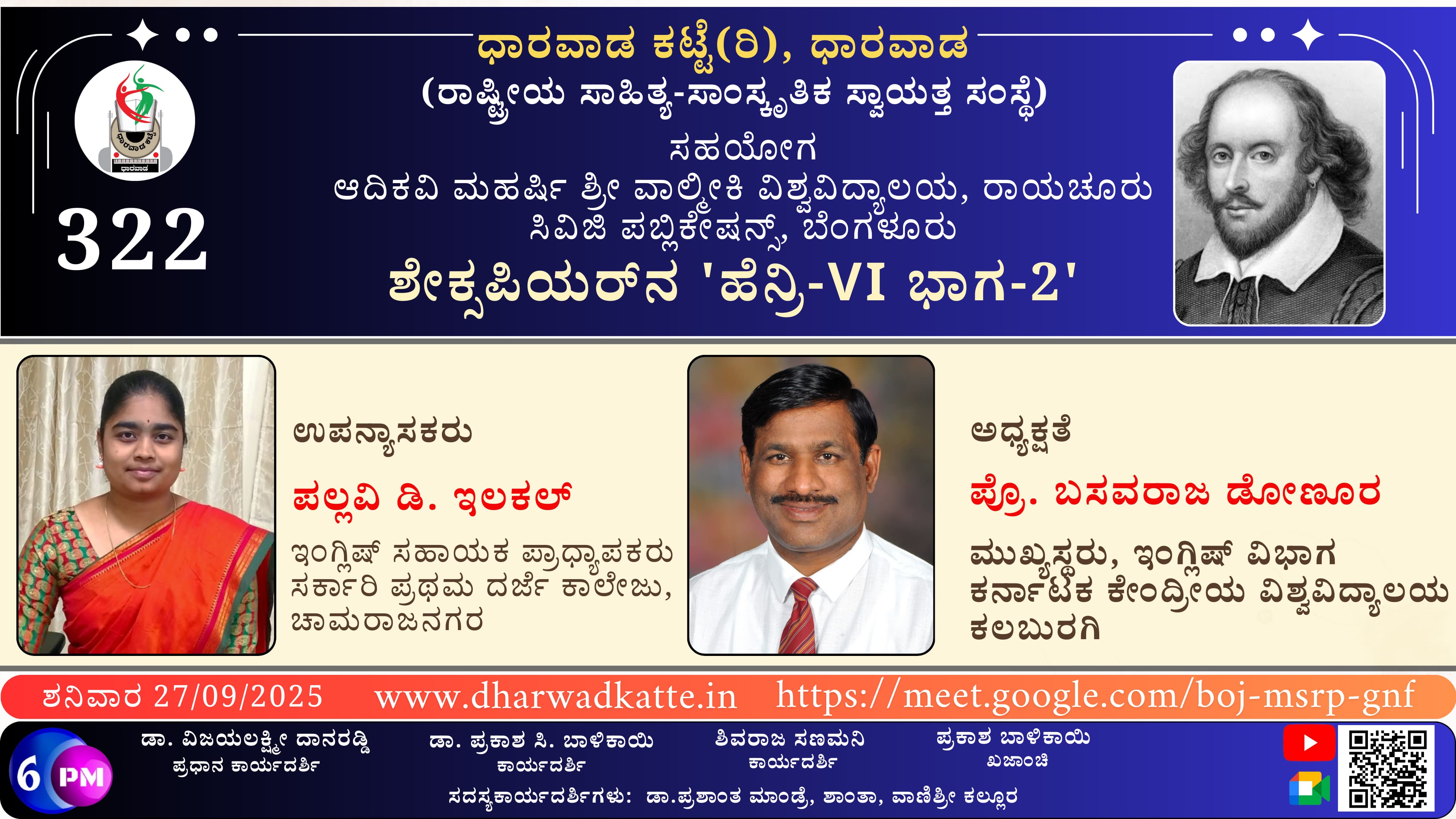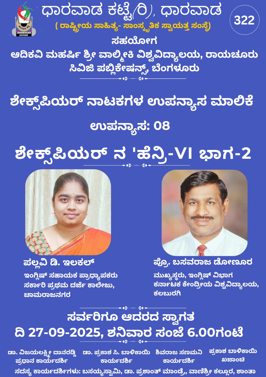 ದಿನಾಂಕ *27-09-2025 ರ ಶನಿವಾರ ಸಂಜೆ 6.00 ಗಂಟೆಗೆ* ಧಾರವಾಡ ಕಟ್ಟೆ ಆಯೋಜಿರುವ *ಶೇಕ್ಸ್ಪಿಯರ್ ನಾಟಕಗಳ ಉಪನ್ಯಾಸ ಮಾಲಿಕೆ* ಯಲ್ಲಿ *ಪಲ್ಲವಿ ಡಿ. ಇಲಕಲ್* ಇಂಗ್ಲಿಷ್ ಸಹಾಯಕ ಪ್ರಾಧ್ಯಾಪಕರು