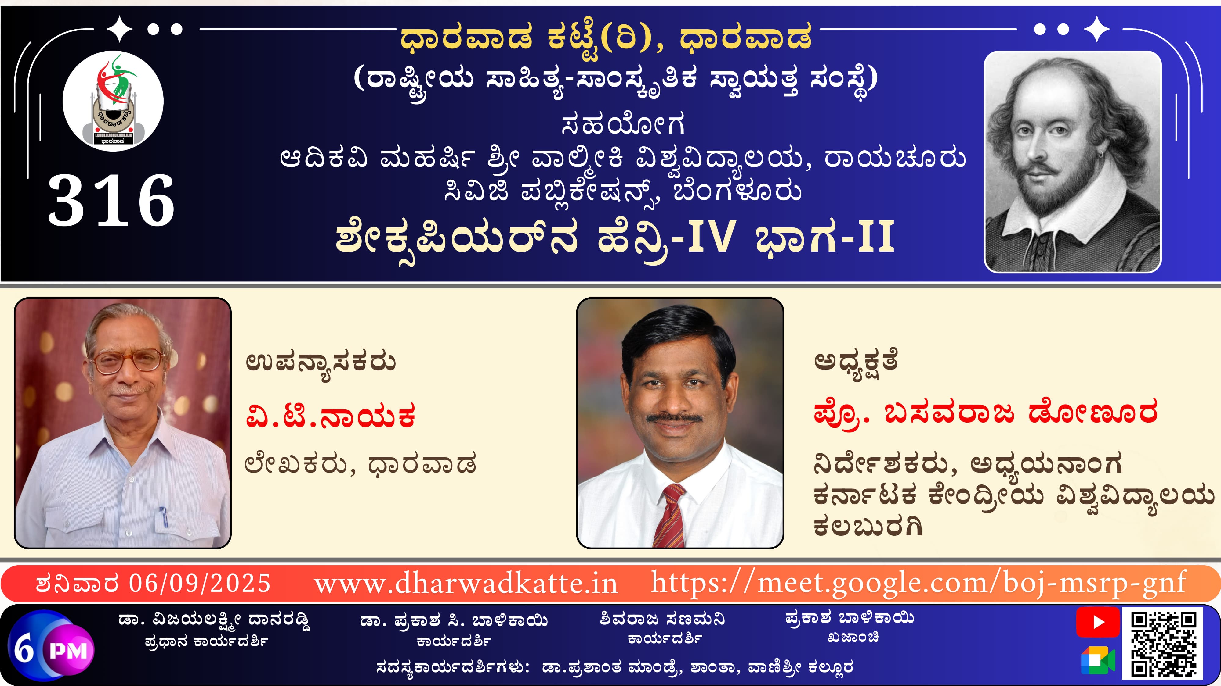 ದಿನಾಂಕ *06-09-2025 ರ ಶನಿವಾರ ಸಂಜೆ 6.00 ಗಂಟೆಗೆ* ಧಾರವಾಡ ಕಟ್ಟೆ ಆಯೋಜಿರುವ *ಶೇಕ್ಸ್ಪಿಯರ್ ನಾಟಕಗಳ ಉಪನ್ಯಾಸ ಮಾಲಿಕೆ* ಯಲ್ಲಿ *ಡಾ. ವಿ.ಟಿ.ನಾಯಕ್* ಲೇಖಕರು,ಧಾರವಾಡ ಇವರು *ಶೇಕ್ಸ್ಪಿಯರ್ ನ ‘ಹೆನ್ರಿ-IV ಭಾಗ-lI’* ನಾಟಕದ ಕುರಿತು ಮಾತನಾಡಲಿದ್ದಾರೆ.