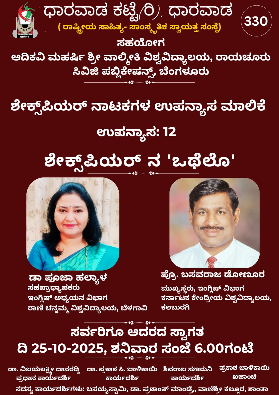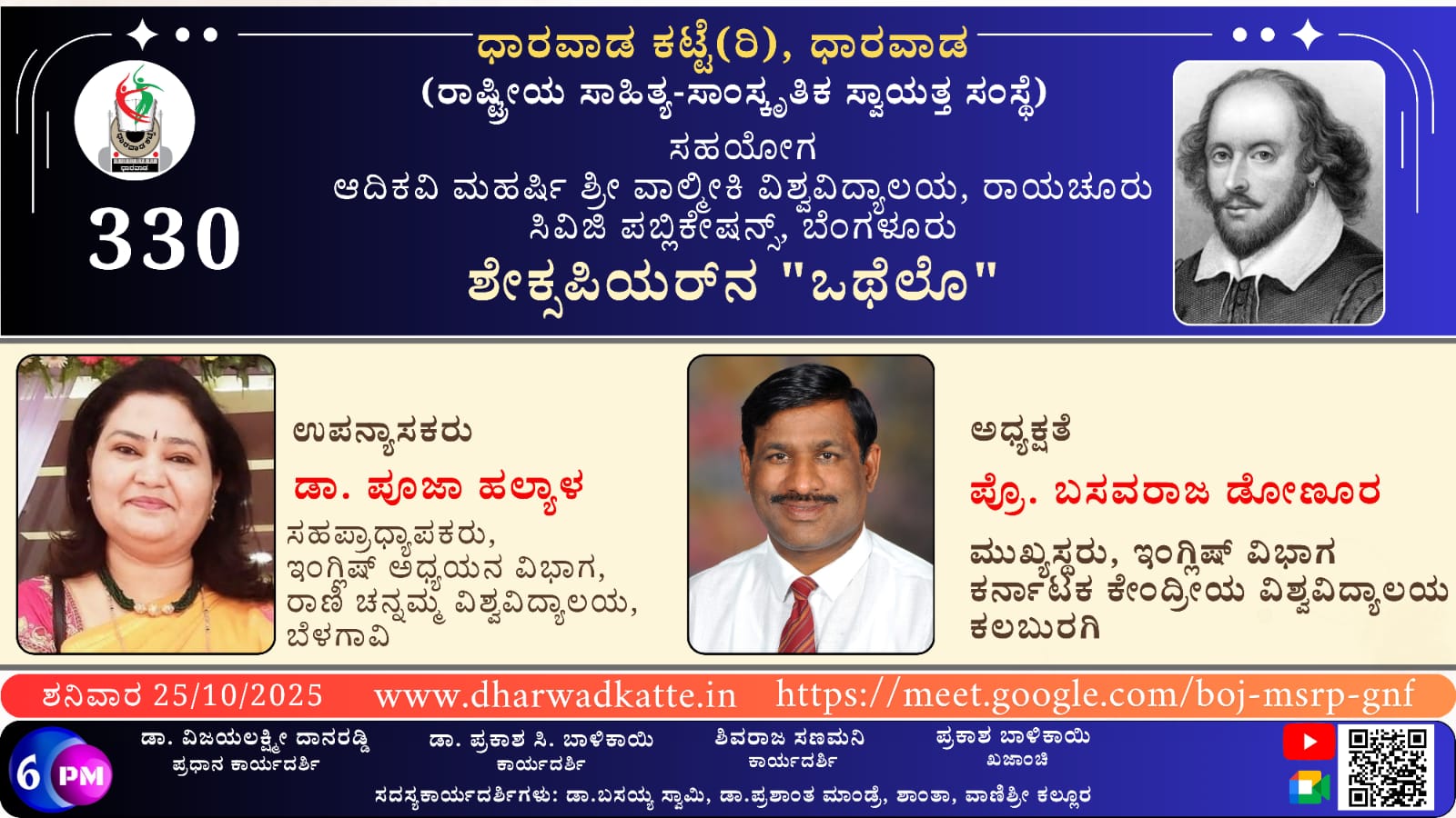 ದಿನಾಂಕ *25-10-2025 ರ ಶನಿವಾರ ಸಂಜೆ 6.00 ಗಂಟೆಗೆ* ಧಾರವಾಡ ಕಟ್ಟೆ ಆಯೋಜಿರುವ *ಶೇಕ್ಸ್ಪಿಯರ್ ನಾಟಕಗಳ ಉಪನ್ಯಾಸ ಮಾಲಿಕೆ* ಯಲ್ಲಿ *ಡಾ ಪೂಜಾ ಹಲ್ಯಾಳ* ಸಹಪ್ರಾಧ್ಯಾಪಕರು,