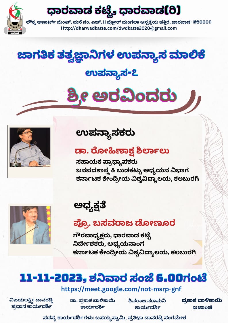 ಧಾರವಾಡ ಕಟ್ಟೆ ಆಯೋಜಿಸಿದ ಜಾಗತಿಕ ತತ್ವಜ್ಞಾನಿಗಳ ಉಪನ್ಯಾಸ ಮಾಲಿಕೆಯಲ್ಲಿ- ಅರವಿಂದರ ಕುರಿರು ಡಾ. ರೋಹಿಣಾಕ್ಷ ಶಿರ್ಲಾಲು ಅವರು ಮಾತನಾಡಿದರು.